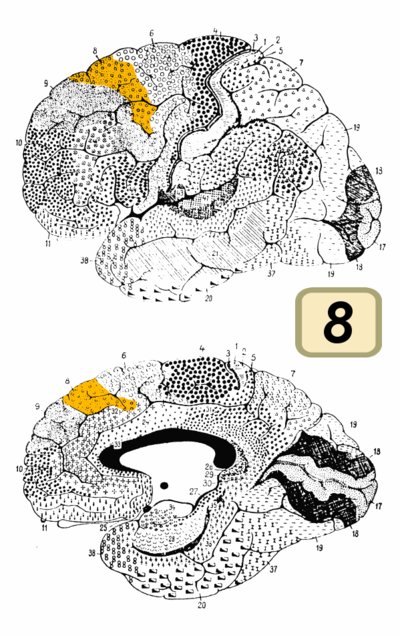 BA 8 er lokaliseret i frontallappen umiddelbart foran BA 6 og omfatter bl.a. det "frontal eyefields" som er involveret i kontrol af voluntære øjenbevægelser (i modsætning til automatiske følgebevægelser).
