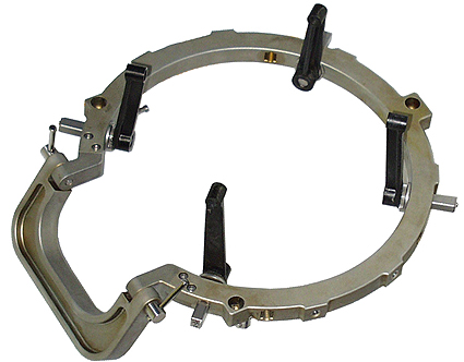 Håret vaskes. Der gives præ-medicin 30min før rammepåsætning. Hos den vågne patient placeres hovedringen bedst i siddende stilling. Rammen kan midlertidig holdes med velcro-bånd eller tape og en støttende hånd. Rammen placeres i orbito-meatalplanet med skruerne så vinkelret på kraniet som muligt og med HovedRingArme skruet så langt ind mod kraniet som muligt. Ved smalle kranier må de frontal HovedRingArme svinges ind mod panden for ikke at skride bag linea temporalis superior. Ved biopsi gennem fossa posterior kippes rammen bagover og placeres lavt. Lokalbedøvelse lægges gennem skruehullerne og efter nogle minutter monteres skruerne og strammes sekventielt.
