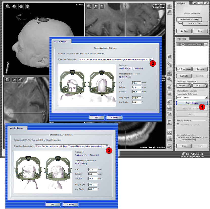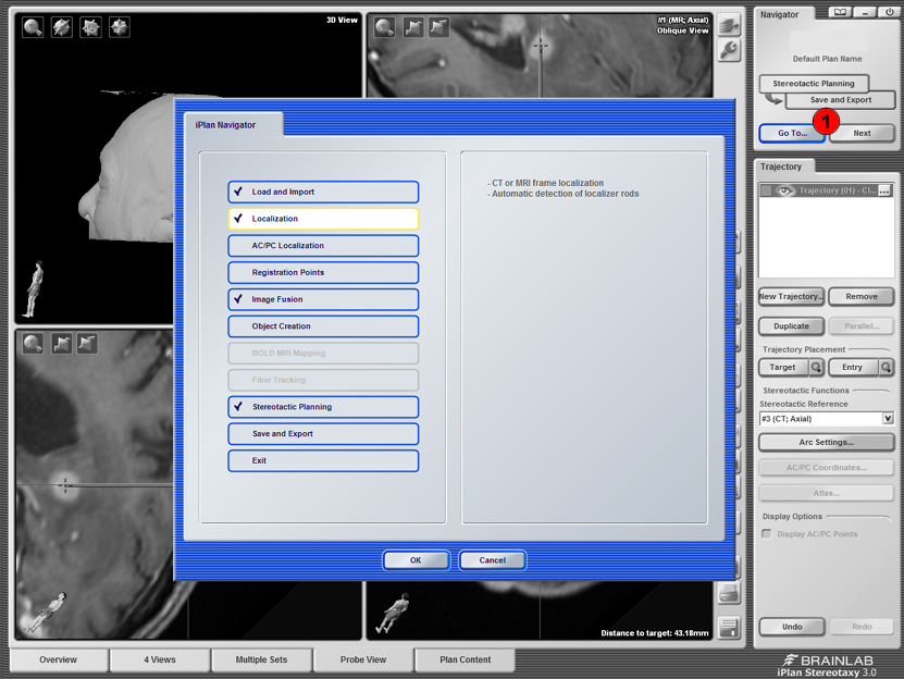 Target bør chekkes på både CT og MR. I MR serien kan man vælge Probe View (1). Her kan man vælge enterypoint så trajectory går perpendikulært på kraniet så boret ikke skrider (2), og man kan scrolle gennem snittene i probe view og sikre at man går mellem corticale kar (3) og hvis det er en scanning uden kontrast kan man vælge toppen af en gyrus. Ved fejlklik kan Undo-knappen anvendes (4).