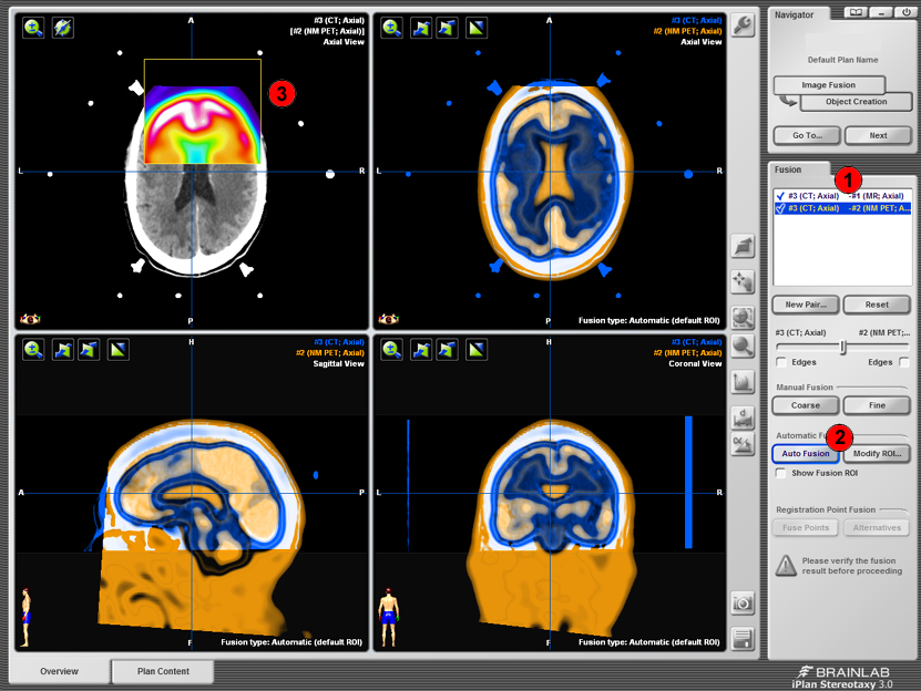 Man vælger scannings-serie i serie-vælgeren (1). Man zoomer ind med lup (2) og scroller i hver plan ved at rulle med musen i det pågældende vindue. Vælg New trajectory (3) og Target-knappen (4) er nedtrykket. Klik på billederne for at markere target. Tryk herefter Entery-knappen for at markere et andet punk på den linie som repræsenterer trajectory. Ved at trykke på de små forstørrelsesglas (4) kan man centrere billederne på hhv det valgte target eller enterypoint. På 3D rekonstruktionen kan man få et indtryk af hvor lokalbedøvelsen skal lægges (5).