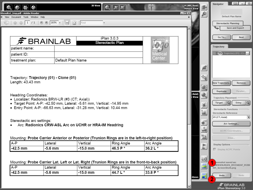 Med print-knappen åbnes en pdf-program og der printes på opeationsgagens printer. Planen gemmes i mappen Neuronavigator..