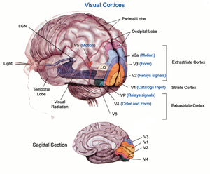 Synssansen og vores evne til at integrere synssansen med stort set alle andre hjernefunktioner er fascinerende. På denne side vil jeg gennemgå del elementerne af vores visuelle apparat fra receptorerne i øjet til den perciperede og integrerede synssans via de visuelle associations cortex. Figur 1 til højre giver et overblik over det primære visuelle system, og viser at informationer vedrørende vores venstresidige synsfelt, opfattes med den højre side af hjerne. Konstruktionen hvor øjnene er lokaliseret anteriort og synsbarken posteriort betyder at sysnbanerne skal passerer gennem en stor del af hjernen, og der for er i risiko for beskadigelse ved læsioner mange steder i hjerne, synsbanerne når på deres vej gennem temporal-, parietal- og occipitallappen.